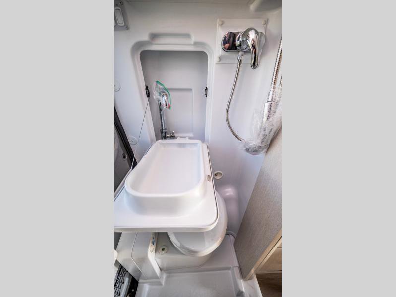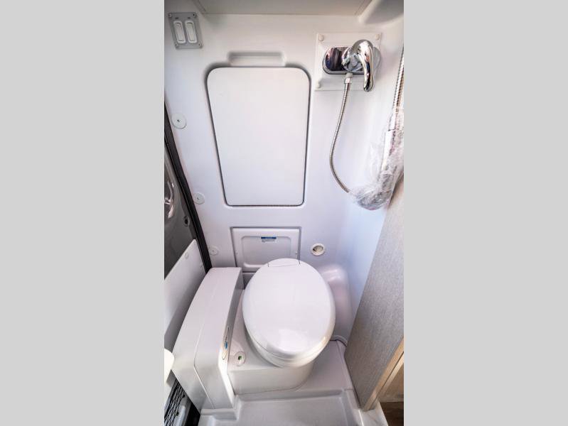 This coach is the perfect home on wheels for all your adventures. You will have everything you need, including a wet bath with a cassette toilet and pocket doors to save space. Once you have prepared breakfast on the two-burner gas cooktop, you can dine on the sofa with a removable table. This area can then be your sleeping space at night since the sofa converts into a 72" x 47" pull-out bed. Whether you're enjoying the fresh air let in by the large opening side windows, or you're sipping on a cold drink under the electric awning, you will love everything about this coach!