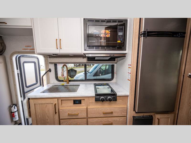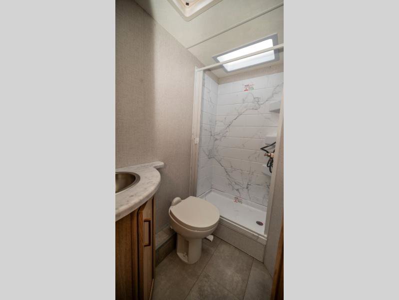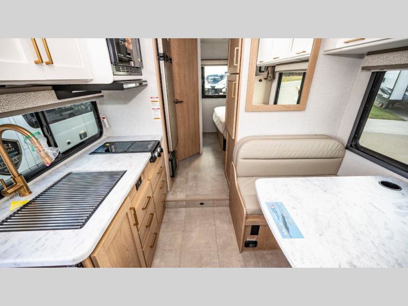 It won't be hard to find comfort in this coach for five! You can freshen up in the rear corner full bath once you've set up camp, then make lunch on the two burner gas cooktop or convection microwave with an air fryer. There is also a 12V refrigerator for cold items and a flip-up countertop for more space. Whether you dine at the Dream Dinette or take your plate outdoors under the 15' power awning, you're sure to have a great time in this motorhome. There is a semi-private bedroom with a 60" x 74" RV queen bed slide and bedroom TV prep if you want the option to watch movies in bed. And your guests can take the Dream Dinette and cab-over bunk at night!