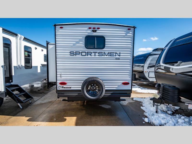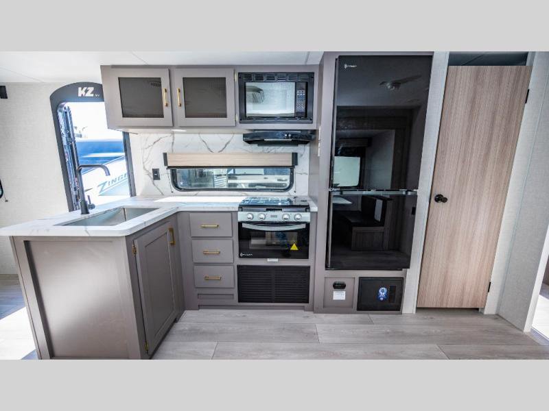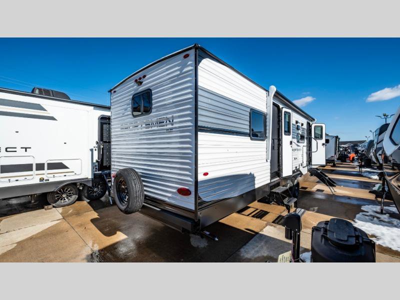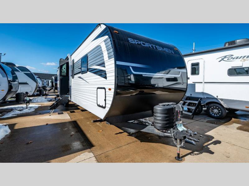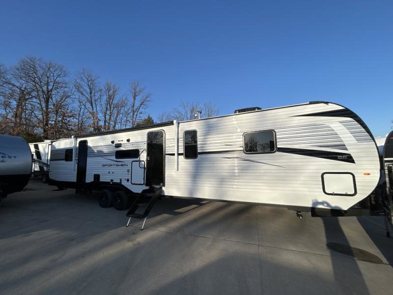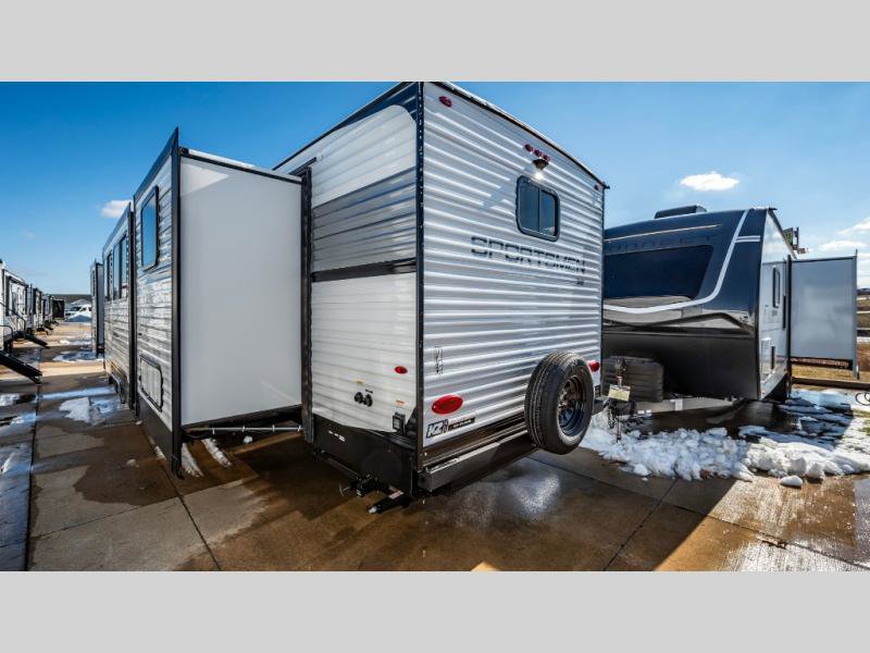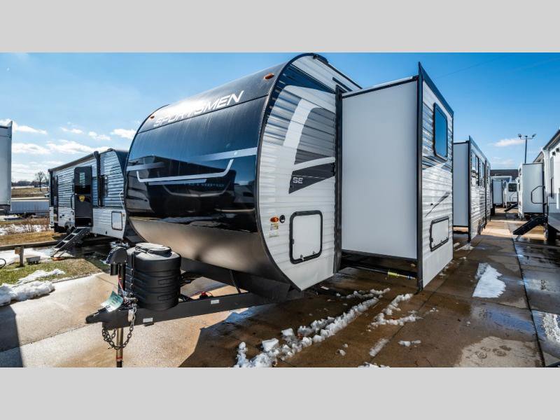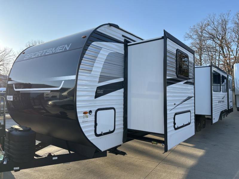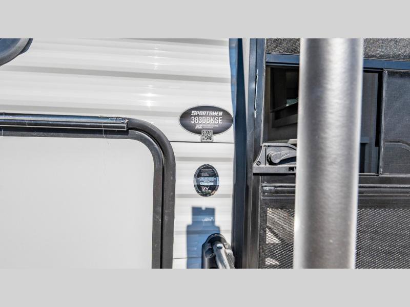 KZ Sportsmen SE travel trailer 383DBKSE highlights: Outside Kitchen Double Private Bedroom Wardrobe/Pantry 30" Fireplace If you've been looking for a travel trailer with plenty of space for your family or group of friends, look no further! There is space for everyone in this model, there are two private bedrooms and each have queen beds to invite even more guests to jump on the adventure. You will admire the amount of storage you will have in each bedroom featuring stunning dressers. Everyone can gather in the main living area at the booth dinette, there is also a jackknife sofa here for more seating while you watch a movie cozied up by the fireplace. When it is time to wind down you will love the two full bathrooms on each side of the RV so no one has to worry about taking turns! Each Sportsmen SE travel trailer and toy hauler by KZ is constructed with KZ exclusive tough shield exterior metal, a one-piece seamless walk-on Tufflex roofing material, and diamond plate rock guard to protect your unit from road debris. You will appreciate the extra large baggage doors for stowing away your gear when not in use, and tinted windows to help keep the harmful sun rays out plus keeping it cooler inside. Some of the exterior conveniences found in the mandatory Advantage Package are the solid folding steps with a large folding grab handle for easy entry and exit, a full glass friction hinged entry door, plus an exterior shower for your pets or to rinse off before you head inside. You'll also appreciate the nitrogen-filled tires, solar and backup camera prep, plus a Leash Latch with a bonus beverage opener. You'll feel right at home inside with linoleum flooring throughout, a 13,500 BTU air conditioner, large overhead cabinets, a shower surround, and much more!