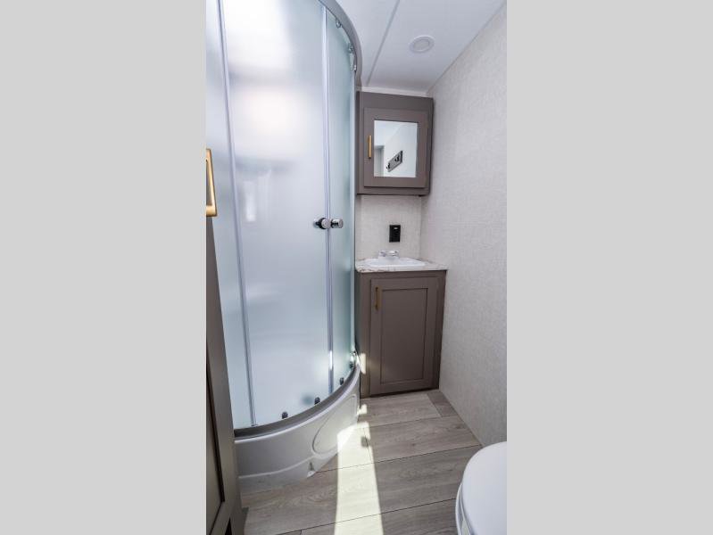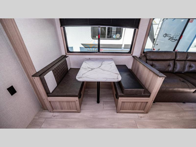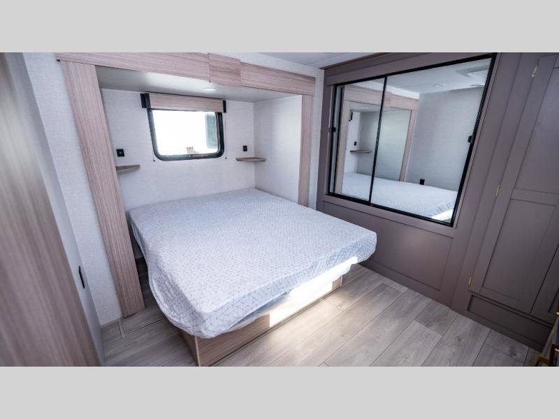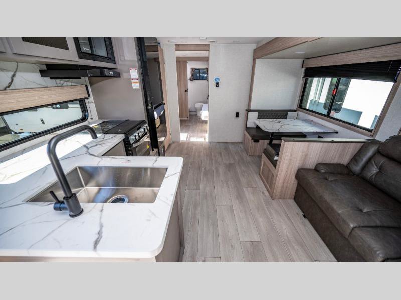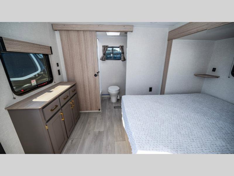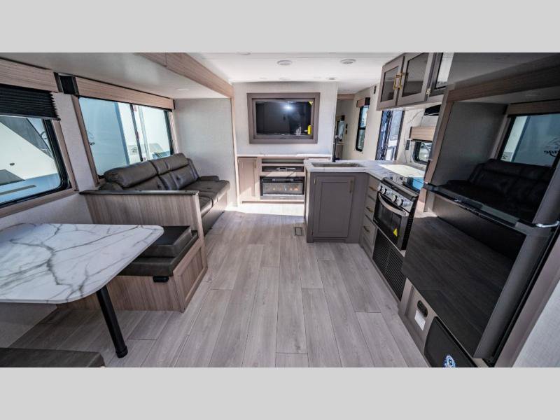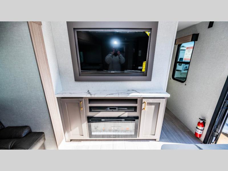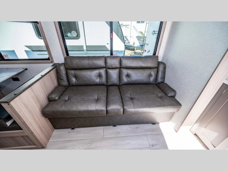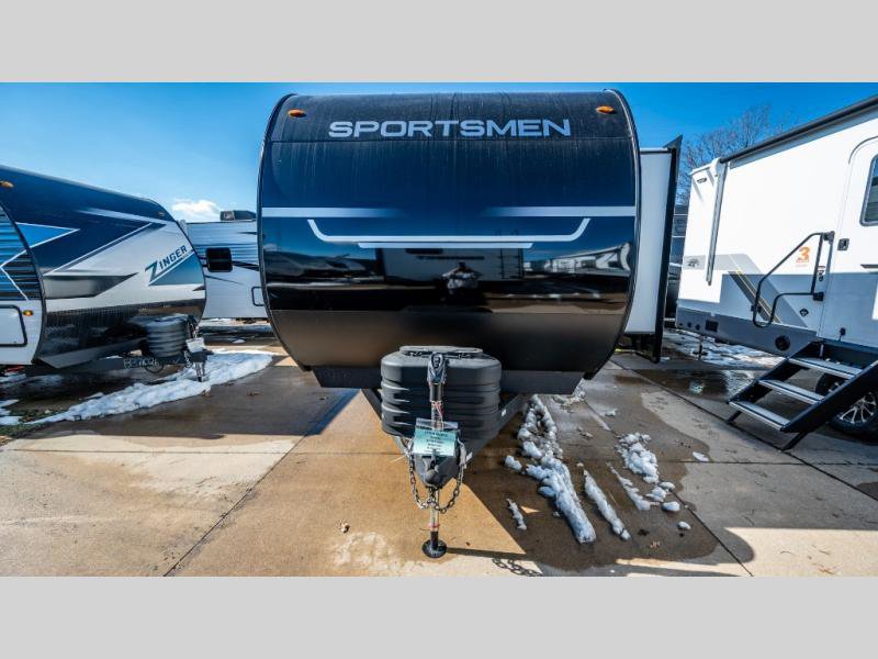 KZ Sportsmen SE travel trailer 383DBKSE highlights: Outside Kitchen Double Private Bedroom Wardrobe/Pantry 30" Fireplace If you've been looking for a travel trailer with plenty of space for your family or group of friends, look no further! There is space for everyone in this model, there are two private bedrooms and each have queen beds to invite even more guests to jump on the adventure. You will admire the amount of storage you will have in each bedroom featuring stunning dressers. Everyone can gather in the main living area at the booth dinette, there is also a jackknife sofa here for more seating while you watch a movie cozied up by the fireplace. When it is time to wind down you will love the two full bathrooms on each side of the RV so no one has to worry about taking turns! Each Sportsmen SE travel trailer and toy hauler by KZ is constructed with KZ exclusive tough shield exterior metal, a one-piece seamless walk-on Tufflex roofing material, and diamond plate rock guard to protect your unit from road debris. You will appreciate the extra large baggage doors for stowing away your gear when not in use, and tinted windows to help keep the harmful sun rays out plus keeping it cooler inside. Some of the exterior conveniences found in the mandatory Advantage Package are the solid folding steps with a large folding grab handle for easy entry and exit, a full glass friction hinged entry door, plus an exterior shower for your pets or to rinse off before you head inside. You'll also appreciate the nitrogen-filled tires, solar and backup camera prep, plus a Leash Latch with a bonus beverage opener. You'll feel right at home inside with linoleum flooring throughout, a 13,500 BTU air conditioner, large overhead cabinets, a shower surround, and much more!