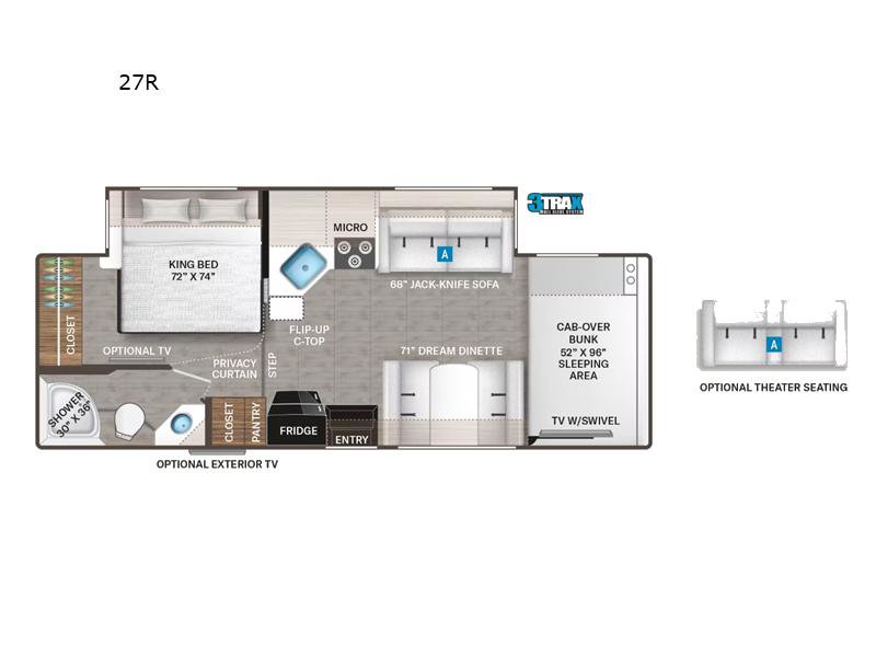 Sleep like a king each time you take this coach on vacation! You and your favorite person will always get a good night's rest even when you have family or friends staying over on the cab over bunk and furniture, plus you can close the privacy curtain if needed. You will have a rear closet for your clothing, and you might choose to add the optional 32" TV to watch your own shows at night. Everyone can take turns getting cleaned up in the full bathroom with a 30" x 36" shower, and there is a closet just outside to stow linens or guest's belongings. The kitchen amenities include a gas cooktop with a glass cover and a microwave oven with option to add a convection microwave oven, and a large stainless steel sink on one side and a double door refrigerator and pantry on the other giving you everything you need to feed everyone. And the jack-knife sofa plus the dream dinette offer a cozy place to visit.